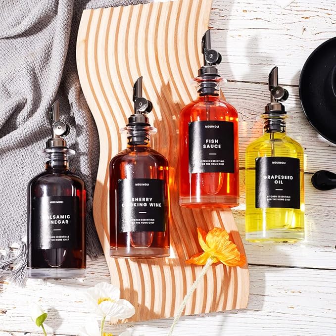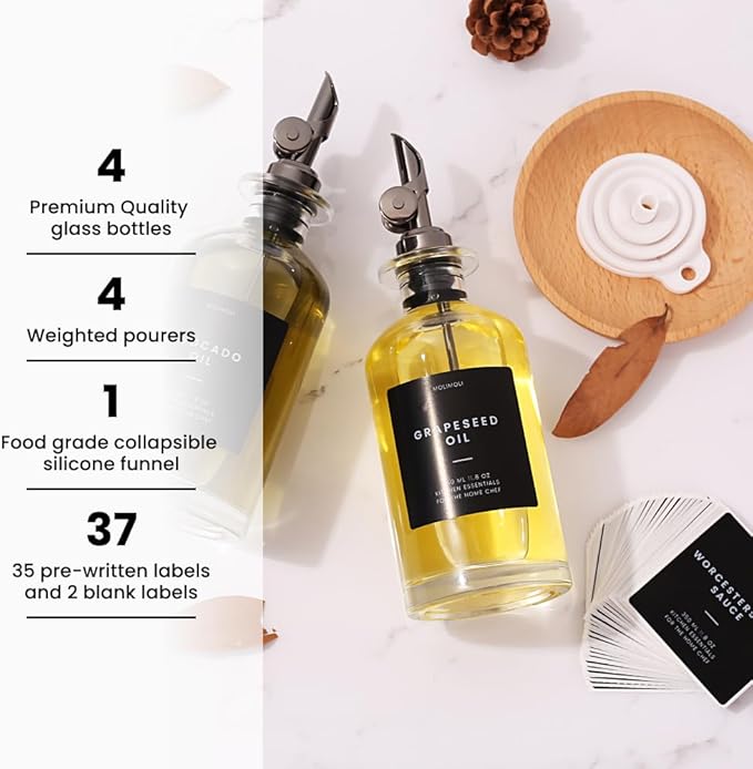 - Modern Kitchen Essential: Minimalism Inspired Cooking Oil Dispenser Bottle. This Set Includes Four High-quality 11.8 Oz (350 Ml) Glass Bottles, Four Black Pourers, a funnel, and a 37 Label Set.