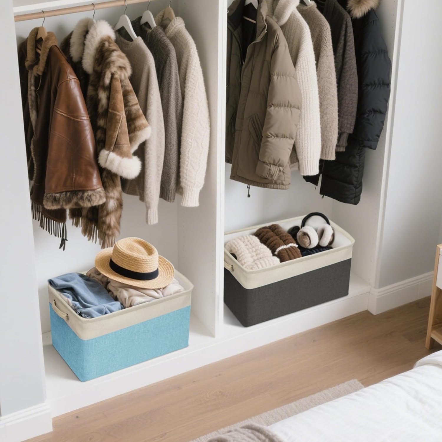 - [CONVENIENT HANDLES] Our closet storage bins come with two sturdy handles on each side that make it easy to carry and transport items from one room to another. These handles are also designed to provide a comfortable grip, ensuring that you can easily move your storage baskets for organizing around without any strain on your hands