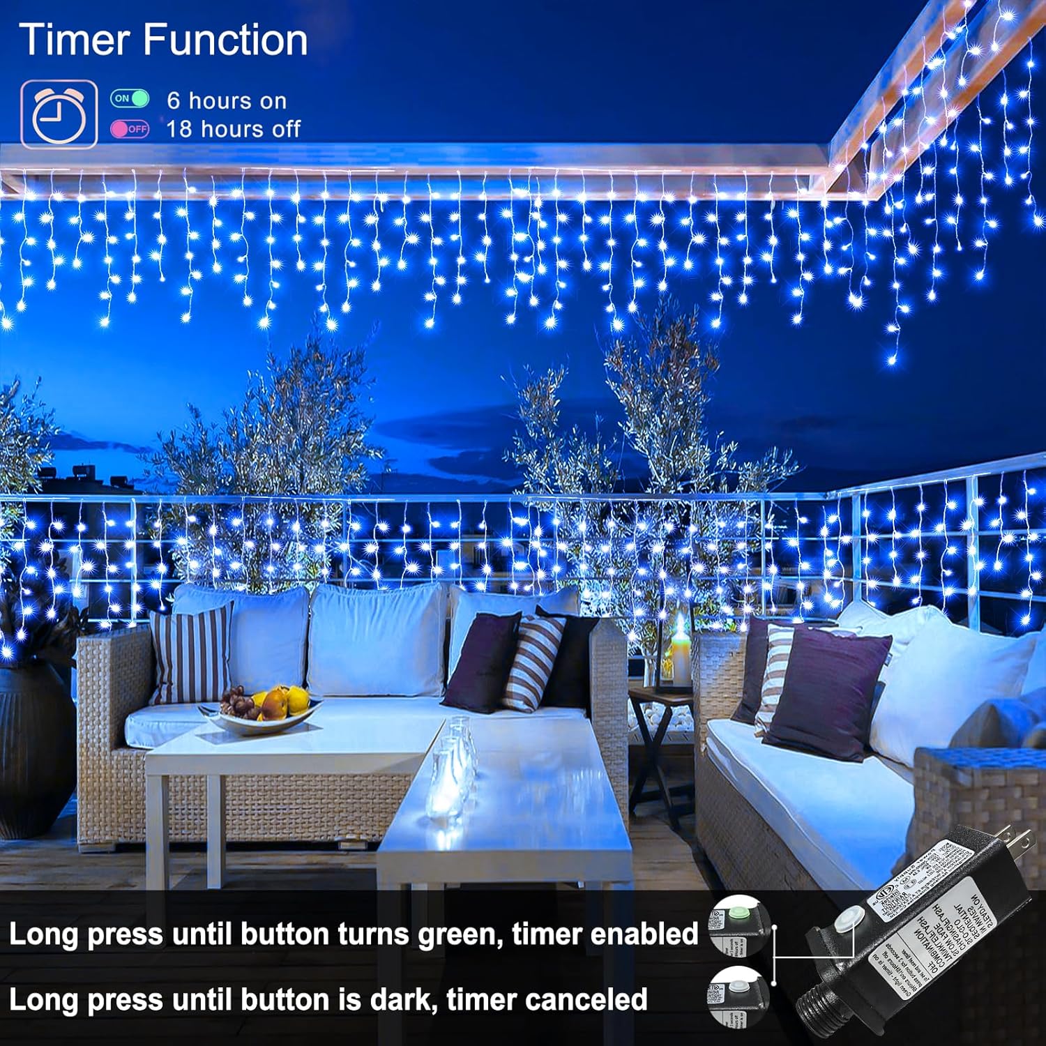 - 【Memory and Timer Function】The outdoor led Christmas lights could recover from the previous setting mode when you restart, no need to reset the mode every time. Press and hold the button on the adapter for 3 seconds until the green light on, then the timer function start, 6 hours on 18 hours off. This smart and convenient led outdoor Christmas lights is the best choice for your holiday decoration.