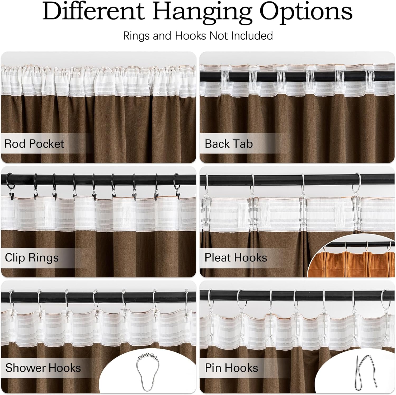- HANGING OPTIONS: Each curtain panel has 3-in-1 top style design: rod pocket, back tab and pinch pleat. Back loop (2.3 inch) and rod pocket (3.1 inch) fit most standard rod. Curtains also can be hung with clip rings or curtain hooks. 3 ways to meet your various needs.