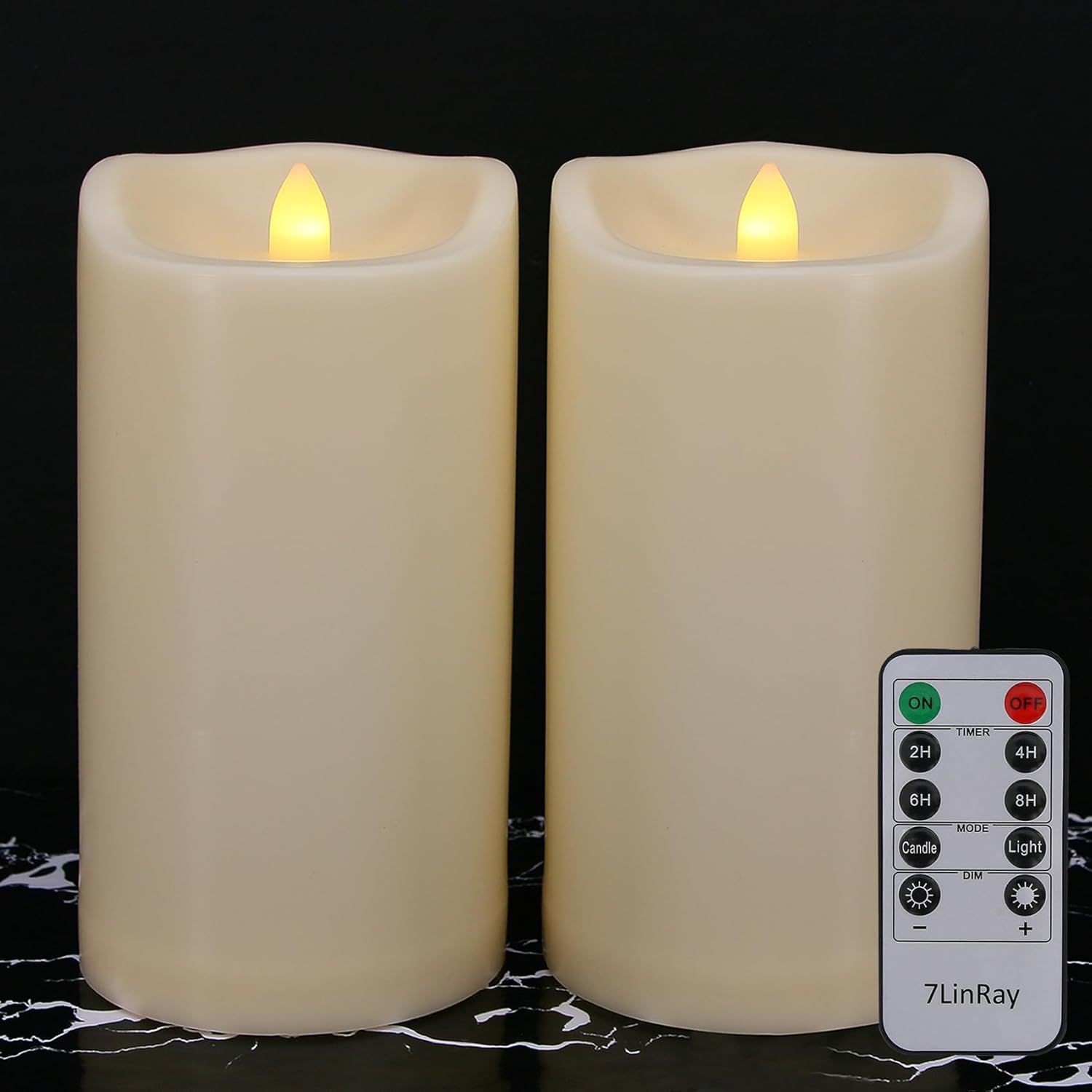 - Remote Control & Timer function: Our battery operated candles come with a remote, you can control them freely and remotely within 50 feet. With 2/4/6/8 hours timer function, you can set the timer length according to your needs. You can freely adjust the light mode (flicker/steady glow) and brightness.our remote control requires 2 AAA batteries(not included)
