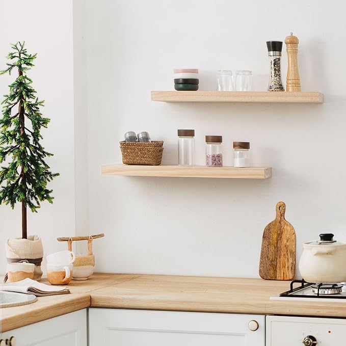 Fun Memories Farmhouse Floating Shelves - 8 Inch Deep Rustic Wood Wall Shelf - Premium Solid Pine Wood Storage Shelf for Kitchen Living Room Bedroom - 24" W x 8" D - Set of 2 - No Stain - Unfinished