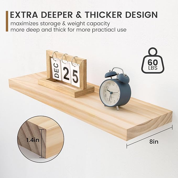 - Extra Deeper & Thicker for Storage - Each board measures 24"W x 8"D x 1.4"H. Extra deeper and thicker design in order to bring maximizes storage space and weight capacity, even hold up to 60 lb. This floating shelf taking up zero square feet, reduces clutter and highlights décor in compact spaces. It can help make full use of the empty wall, making it much more space-saving and making your room look larger and tidier.