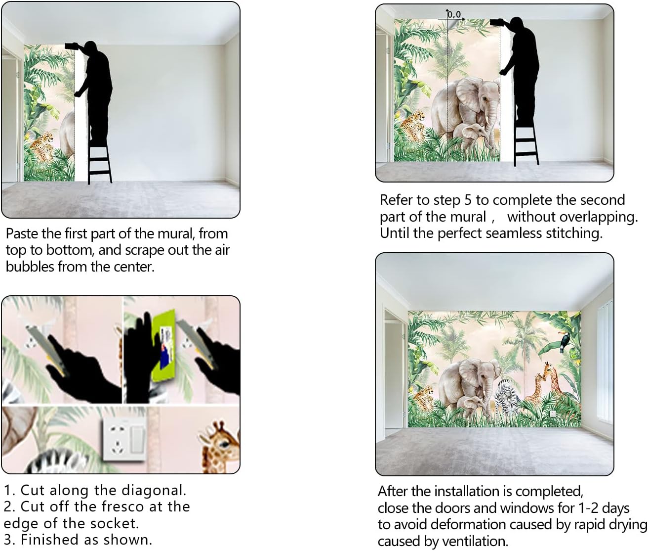 - It's easy to install: at the bottom of each mural we have a numbered sequence, You can refer to the instructions we provided and the main picture 6-7,just match the numbers and you'll be amazed!