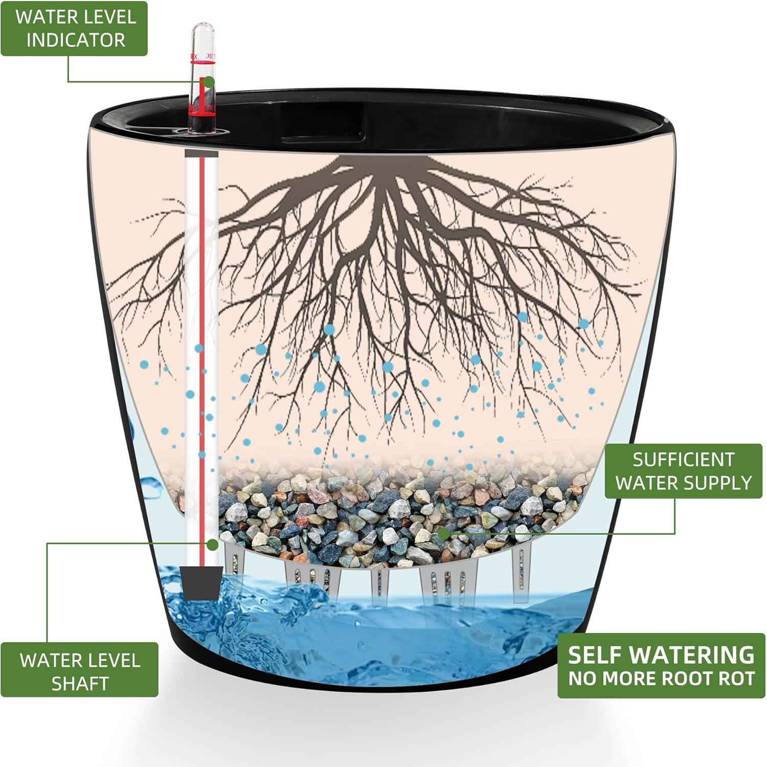 - NEVER MISS WATERING AGAIN - The hydroponic device keeps water ready, then watering time is at your discretion on the gauge. The design of drainage plug and spillway hole is to avoid cycles of overwatering and underwatering, pull out the plug to drain the excess water on rainy days outdoors. The sufficient water supply system enables double the water-efficient than conventional pots. Don't be anxious about missing watering while you enjoy a long term holiday on a journey or travel outside