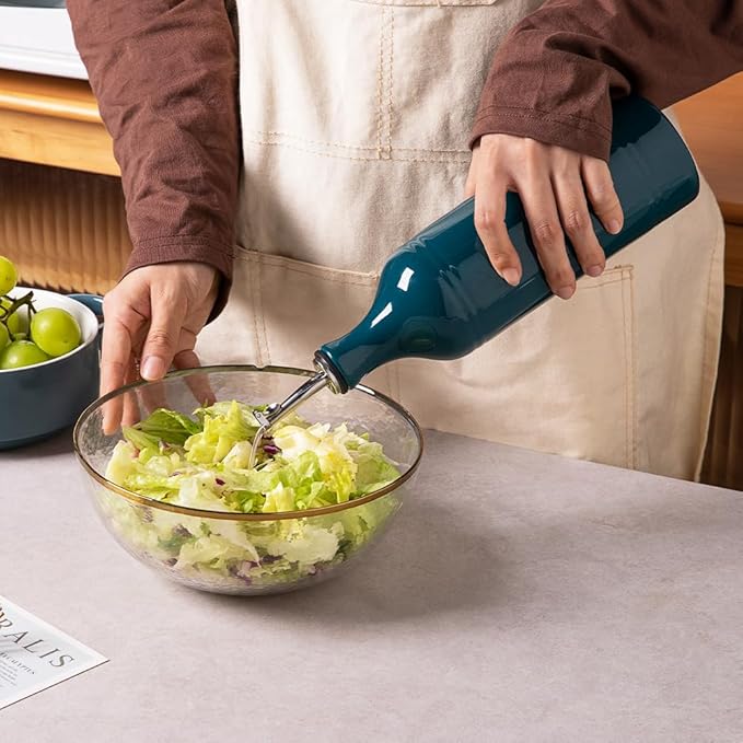 - Easy to Hold, Elegant Dispenser The oill dispenser bottle has a smooth curve for hold easily. And the brightly colored oil and vinegar bottles would look great on counter, table or your cupboard!