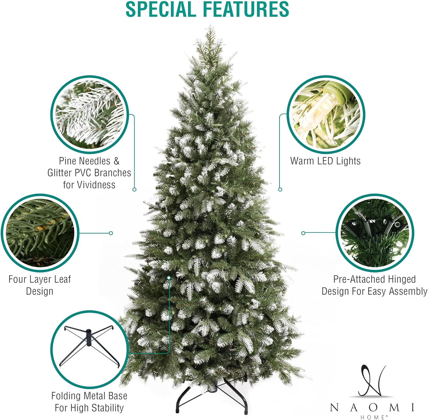 Naomi Home 4.5ft White Tip Christmas Tree with Lights, Realistic Light Snow Flocked Fir Prelit with 679 Branch Tips, 200 Warm Lights and Metal Stand, Aritificial Tree