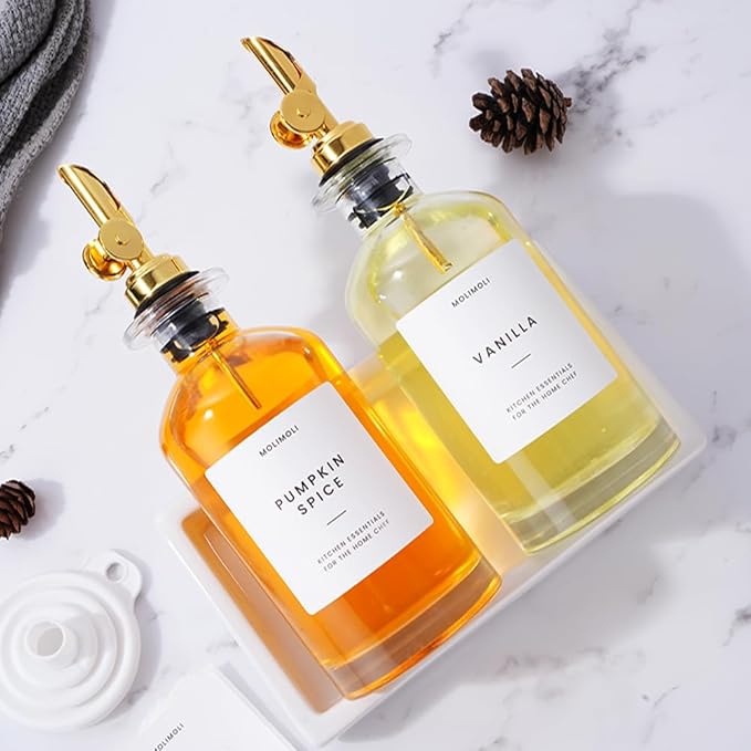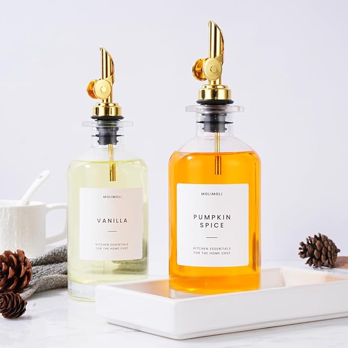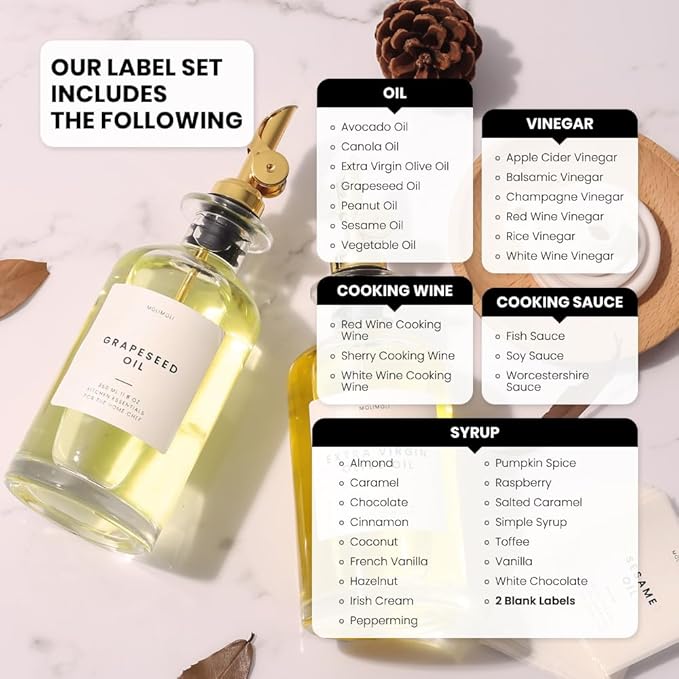 - Modern Kitchen Essential: Minimalism Inspired Cooking Oil Dispenser Bottle. This Set Includes Two High-quality 11.8 Oz (350 Ml) Glass Bottles, Two Gold Pourers, a funnel, and a 37 Label Set.