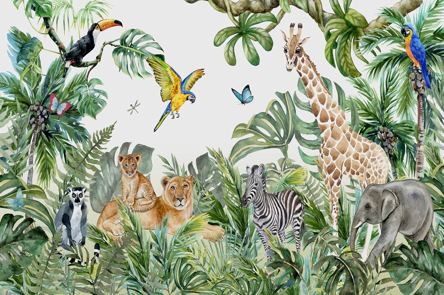 Safari Wallpaper for Children with Animals Jungle Wall Mural Watercolor Animals Nursery Wallpaper Kids Room Decor(Not Peel n' Stick)