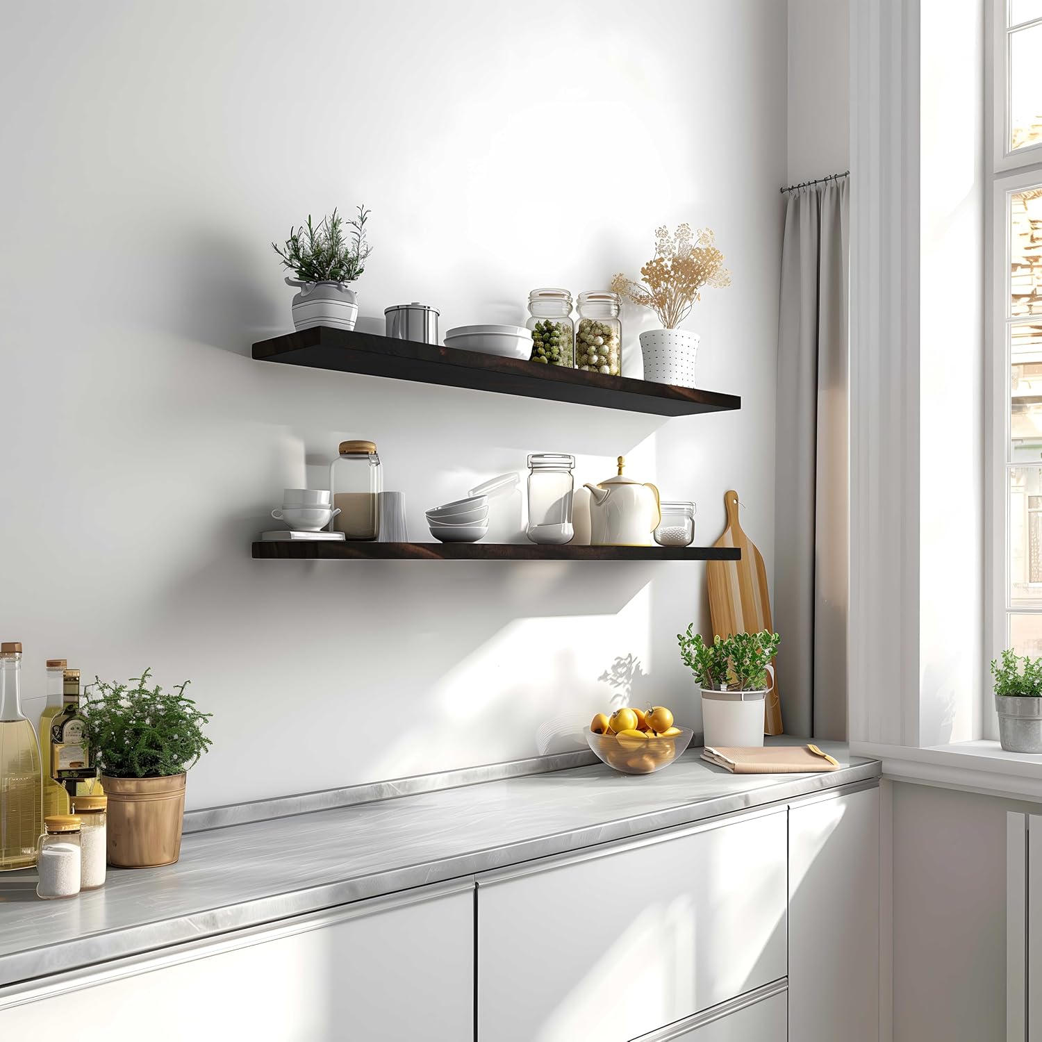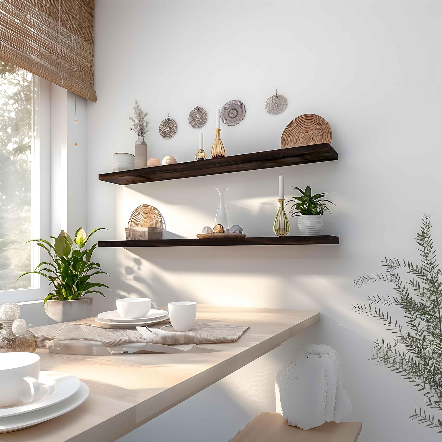 Wood Floating Shelves for Wall Decor, Rustic Wall Shelves for Bedroom Bathroom Kitchen Living Room, Set of 4 Walnut 48 Inch
