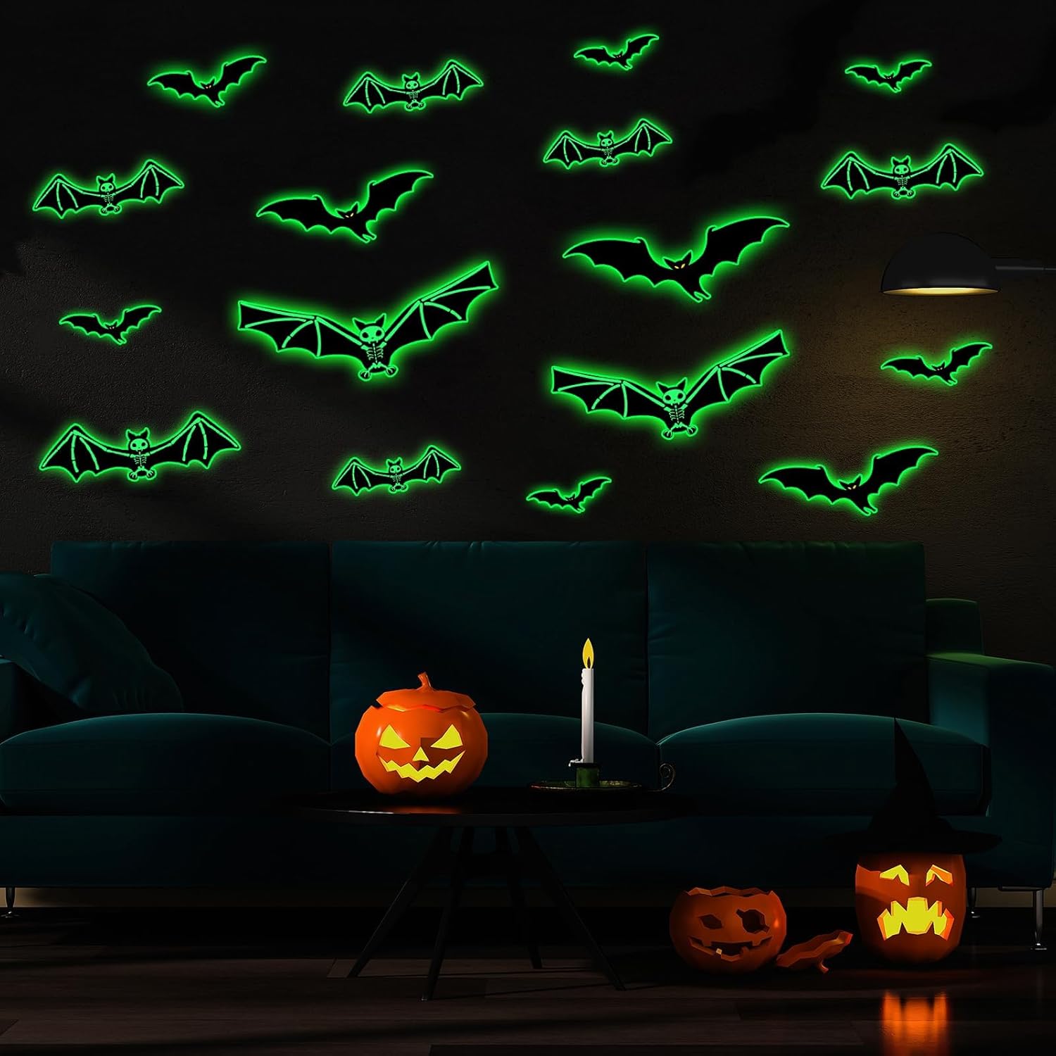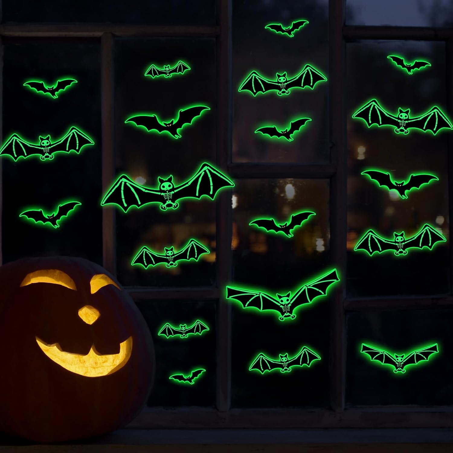 3 Sheets Glow in The Dark Halloween Skeleton Bat Decals Luminous Halloween Skeleton Bat Stickers Removable Bat Wall Decor Glowing Window Clings for Scary Halloween Theme Party Decorations