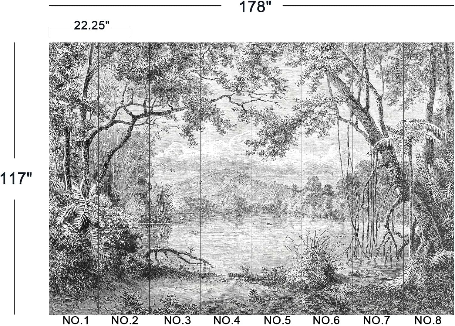 - The size of the wallpaper is 178" wide x 117" high and divided into 8 panels.