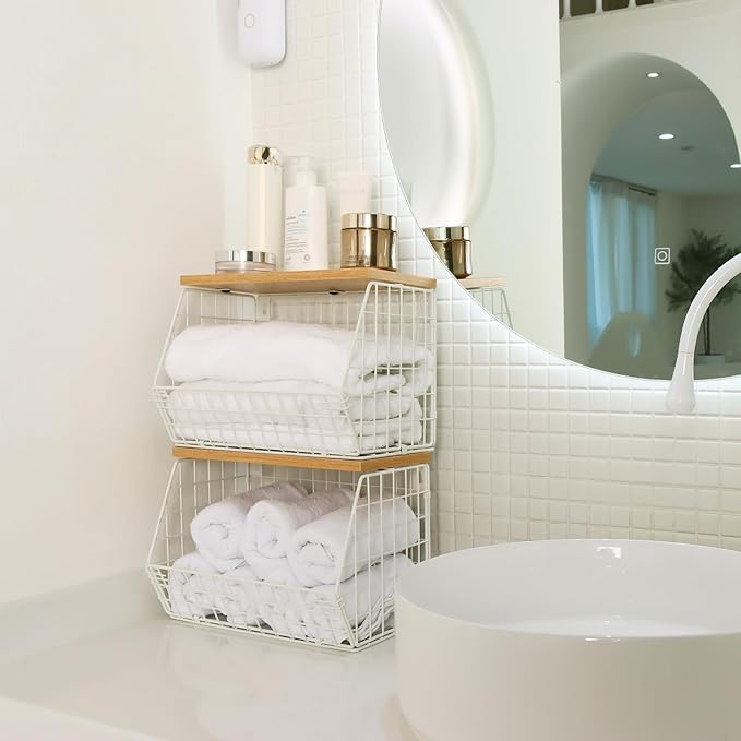 - Versatile Stackable & Wall-mounted Produce Basket: This white snack organizer is designed for convenience, offering stackable and wall-mounted options. It's an ideal choice for your pantry storage. The wooden lid top of this countertop organizer adds extra storage space for small items like seasoning jar, magazine, office supplies,bathroom toiletries etc