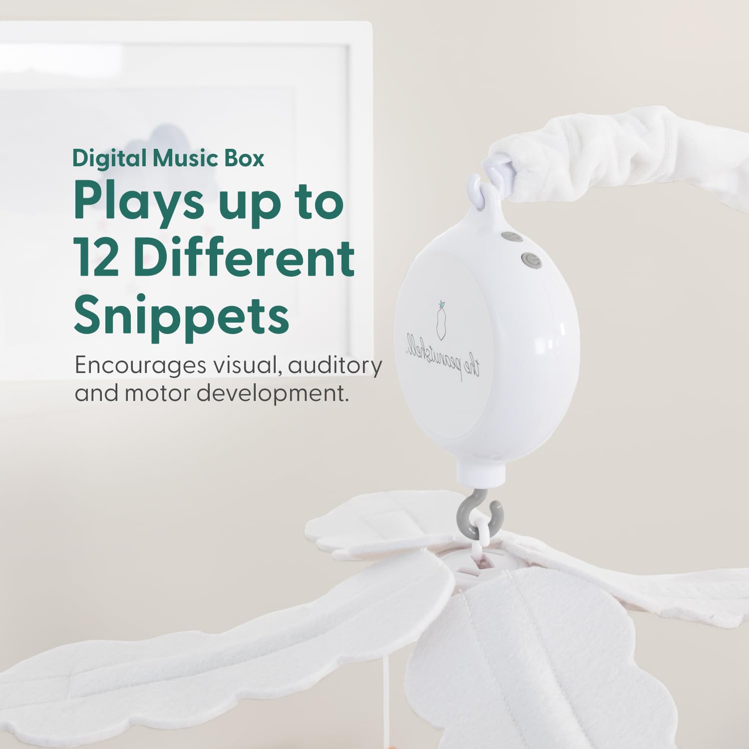 - Versatile Melodies: With a digital music box that offers 12 different lullabies, you can easily change the song to suit your baby’s mood. The handy volume control lets you keep it soft or a little louder.