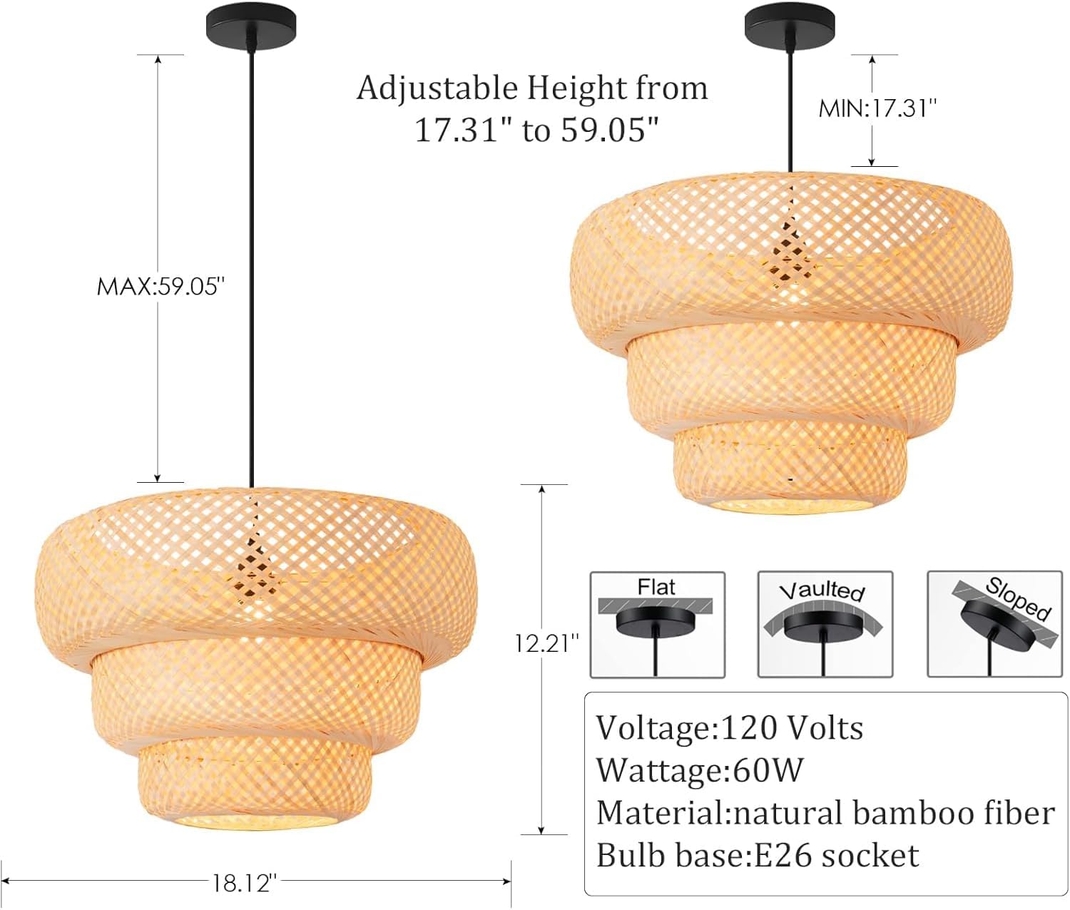 Bamboo Pendant Light,18.5" Boho Rattan Hanging Light 3-Tier Hand Woven Wicker Chandelier for Kitchen Island for Kitchen Island Dining Bedroom Living Room Restaurants