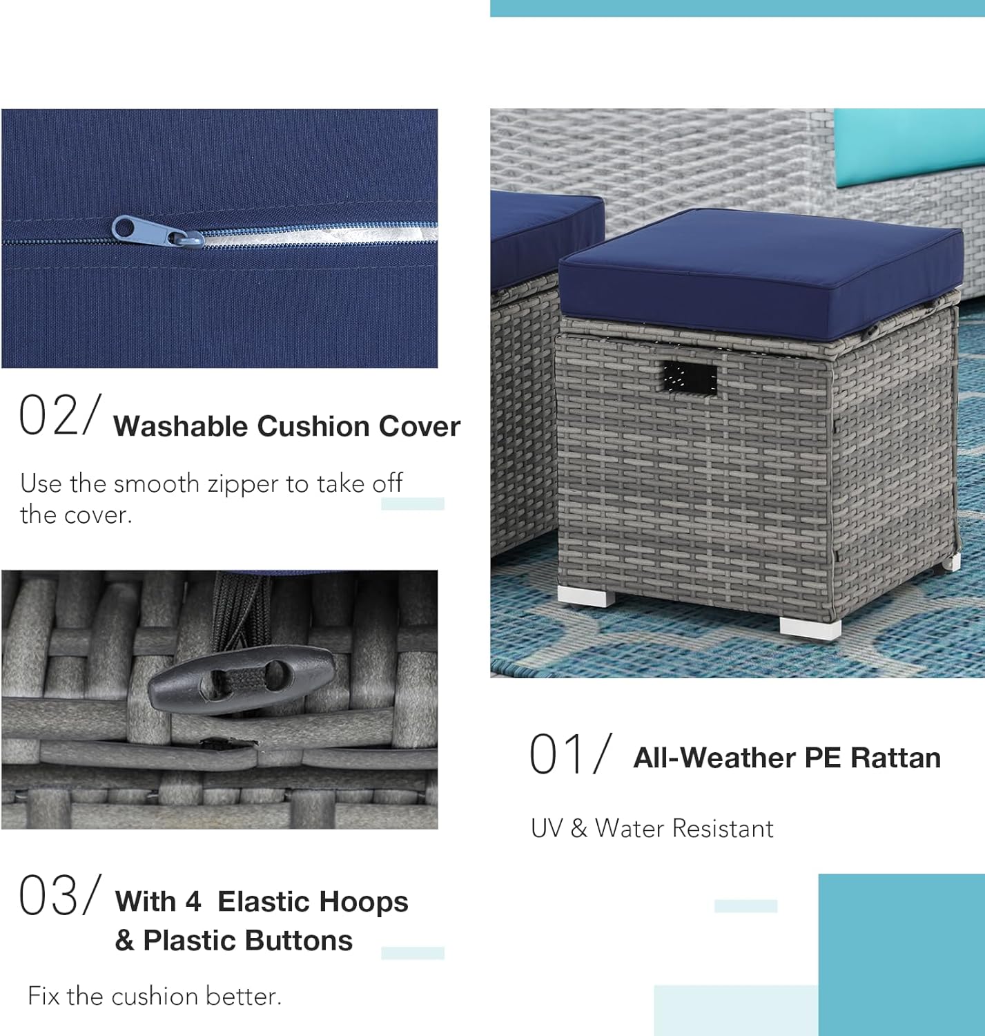 Patiorama 2 Piece Outdoor Patio Ottomans,All-Weather Grey PE Rattan Wicker Ottoman with Storage,Outdoor Footrest Footstool Seat w/Thick Cushion,Built-in Handle for Backyard Poolside Porch (Navy Blue)