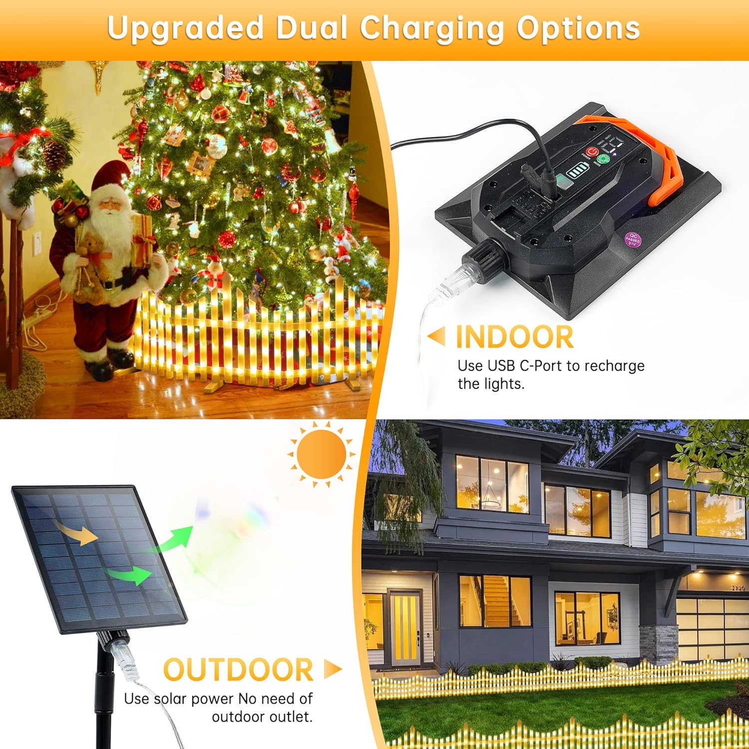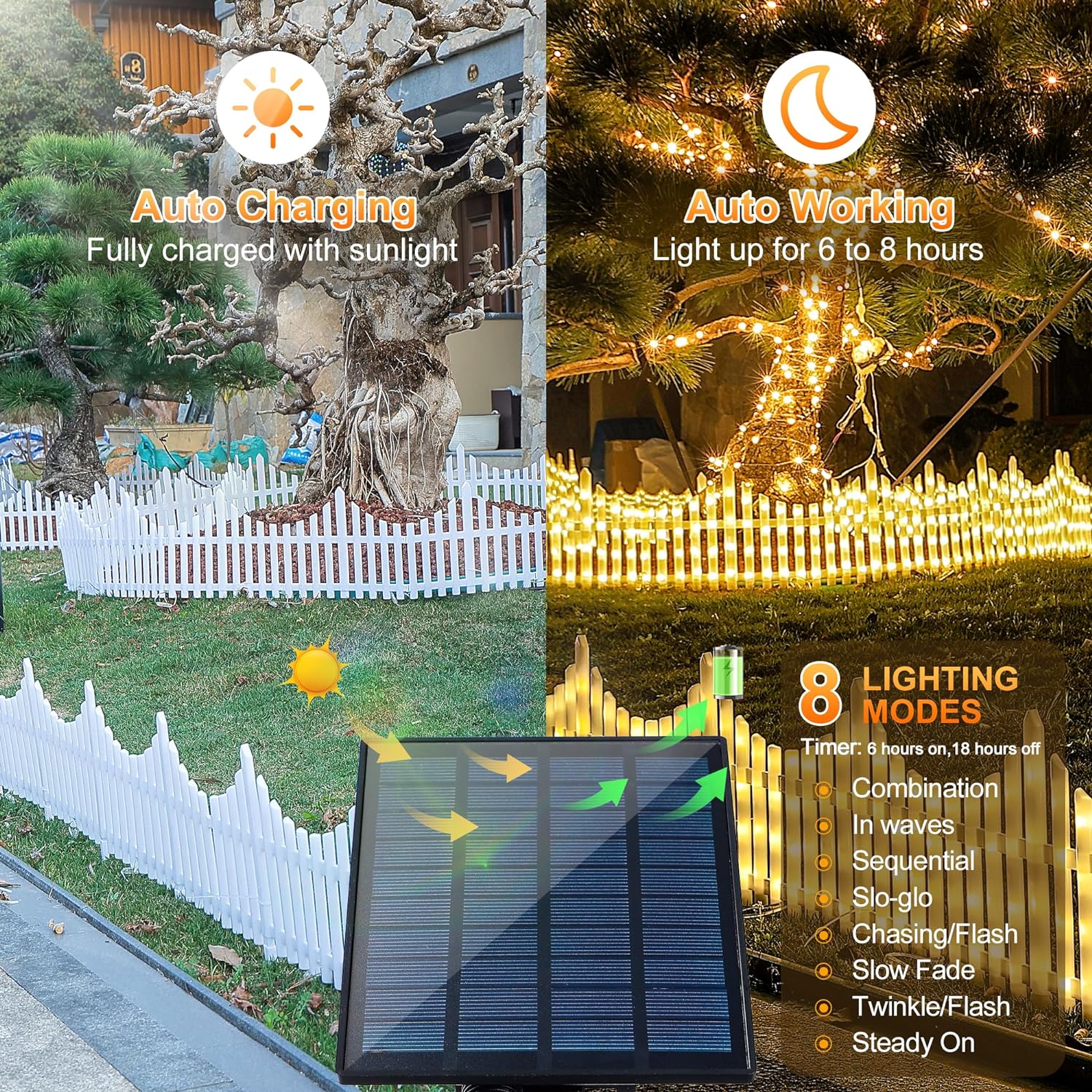 - ☔【8 Lighting Modes&Weatherproof】The Christmas tree fence solar lights can switch fantastic 8 lighting modes(combination,in wave,sequential,slo glo,chasing/flash,slow fade,twinkle/flash,and steady on) by the remote or the back of solar panel.And the outdoor decorative fence lights can withstand all kinds of weather all year round,it is very suitable for all kinds of holiday decorations in restaurants,hotels,clothing stores and flower shops.