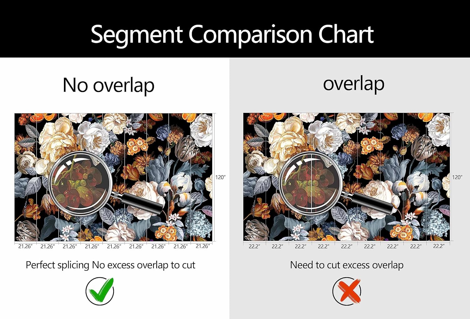 - Mural Size: The total size of this mural wallpaper is 191" x 120" / 486CM x 305CM (W x H), cut into 9 pieces, each measuring 21.26" x 120", for easy installation.