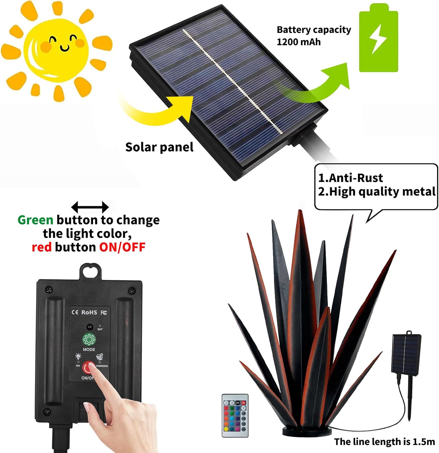 Large Tequila Rustic Sculpture, Rustic Metal Agave Plants for Outdoor Patio Yard, Home Decor Hand Painted Metal Agave Garden Yard Statue, Outdoor Lawn Ornaments (Black - L (W/Solar Light))