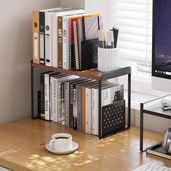 Mitus Shelf Organizer and Storage, Tiered Wood Cabinet Rack for The Kitchen Counter, Bathroom Counter, Pantry Cupboard, Office Desk Bookshelf, 16" Wide Walnut Brown and Black