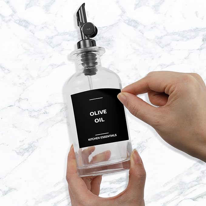 - Includes 55 Sticker Labels — Customize your glass oil dispenser thanks to the complimentary 55 waterproof and oil proof sticker labels made from PVC. Each label is minimalistic and clearly shows the contents of the bottle for convenience and decor.