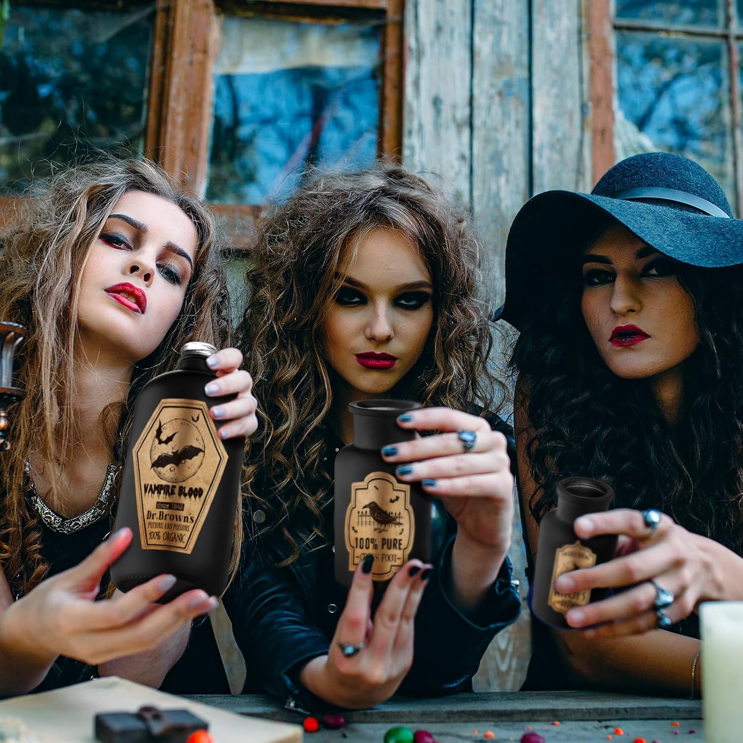 - Vintage Halloween Decorations Set: you will receive 3 pcs black Halloween glass potion bottles in different size, and 12 pcs spooky apothecary jars label; Add the stickers, and you will have awesome small potion jar decorations
