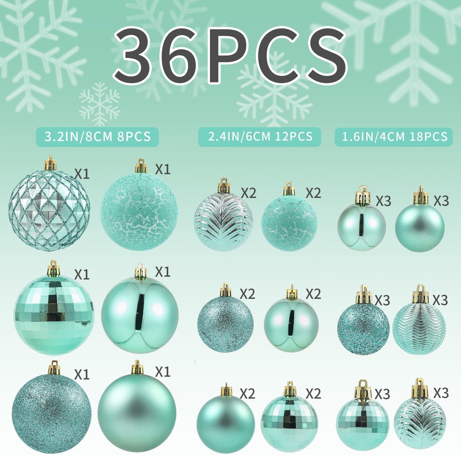 - Multiple Style Matching - With 3 sizes and 18 different styles, the LANGXUN Copper Orange Christmas ornaments balls set includes a total of 36 balls. This set features 8 balls measuring 3.2 inches, 12 balls measuring 2.4 inches, and 18 balls measuring 1.6 inches.