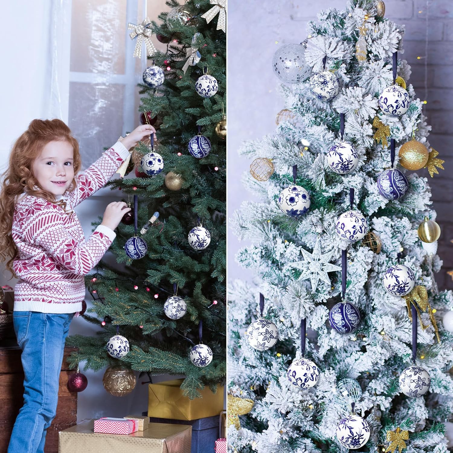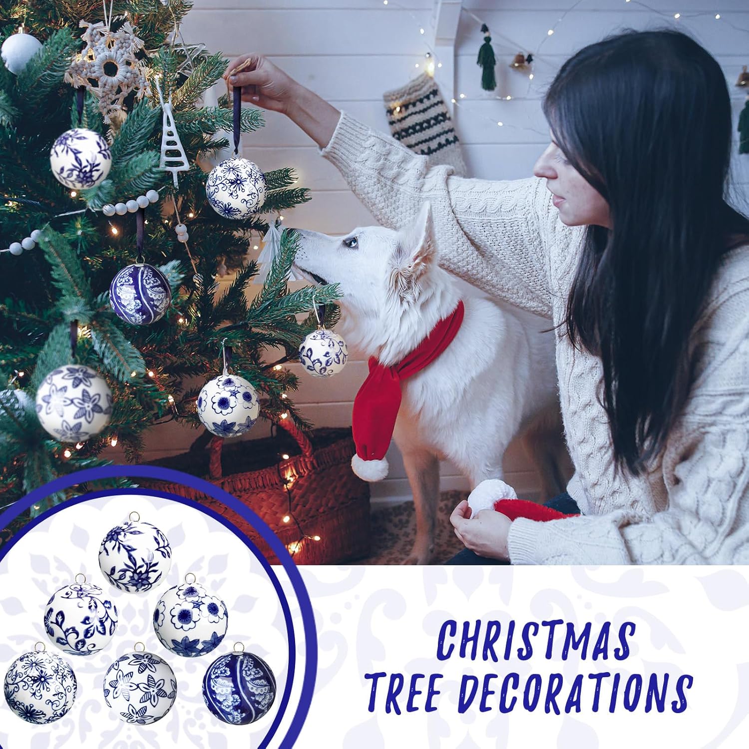 Cindeer 6 Pcs Blue and White Christmas Porcelain Balls 2.4 Inch Porcelain Chinoiserie Ornament Bulk Christmas Ceramic Hanging Decorative for Tree Home Xmas Party (Stylish Style)