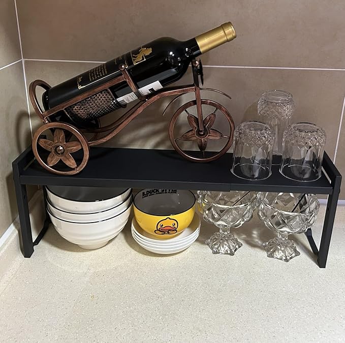 Expandable Cabinet Shelf Organizer 16-26" L Stackable Kitchen Counter Shelf Rack Stand Sink Riser Countertop Storage Black (Narrow 5.1”D)