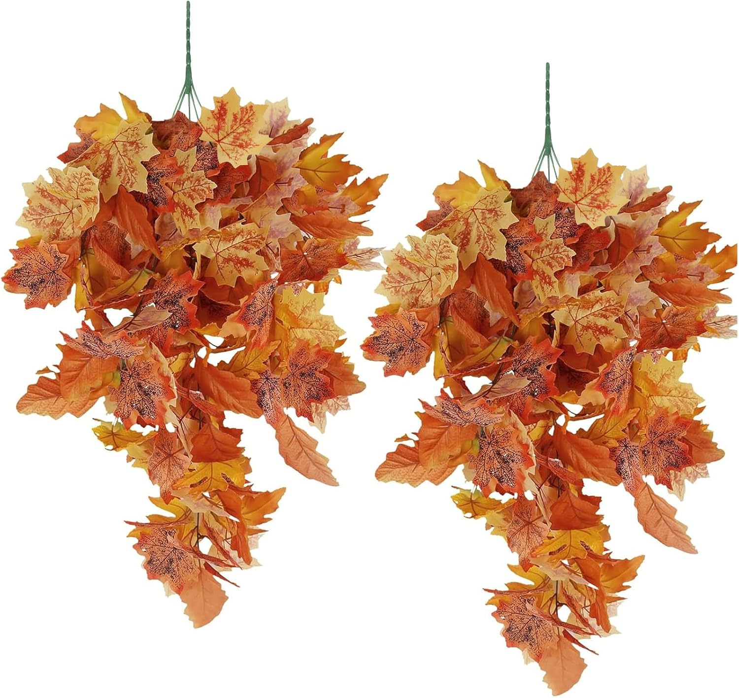 - [Package include]2pcs fall maple leaf hanging plants,the each length of the artificial Hanging plant is approx. 2.5Ft long,and it has 5 flexible stems and a few branches with orange leaves.You can easily hang artificial hanging maple vines anywhere you want and it is a great choice for autumn decoration .