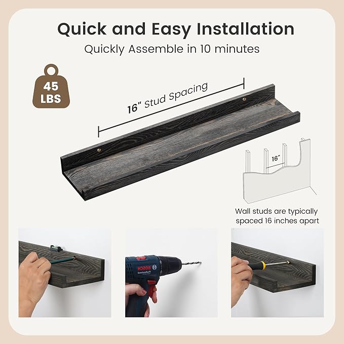 - Easy to Install: You will get a level, screws for the wall, drywall anchors, a detailed installation guide, and two beautiful hand-crafted solid pine wood shelves. With the level, you can make sure your picture ledge shelves are well aligned. Just follow the simple instruction to install the hanging shelves for wall decor within 10 minutes. We add additional screw and anchor to the hardware bag just in case. If you have any questions about our products, please feel free to contact us