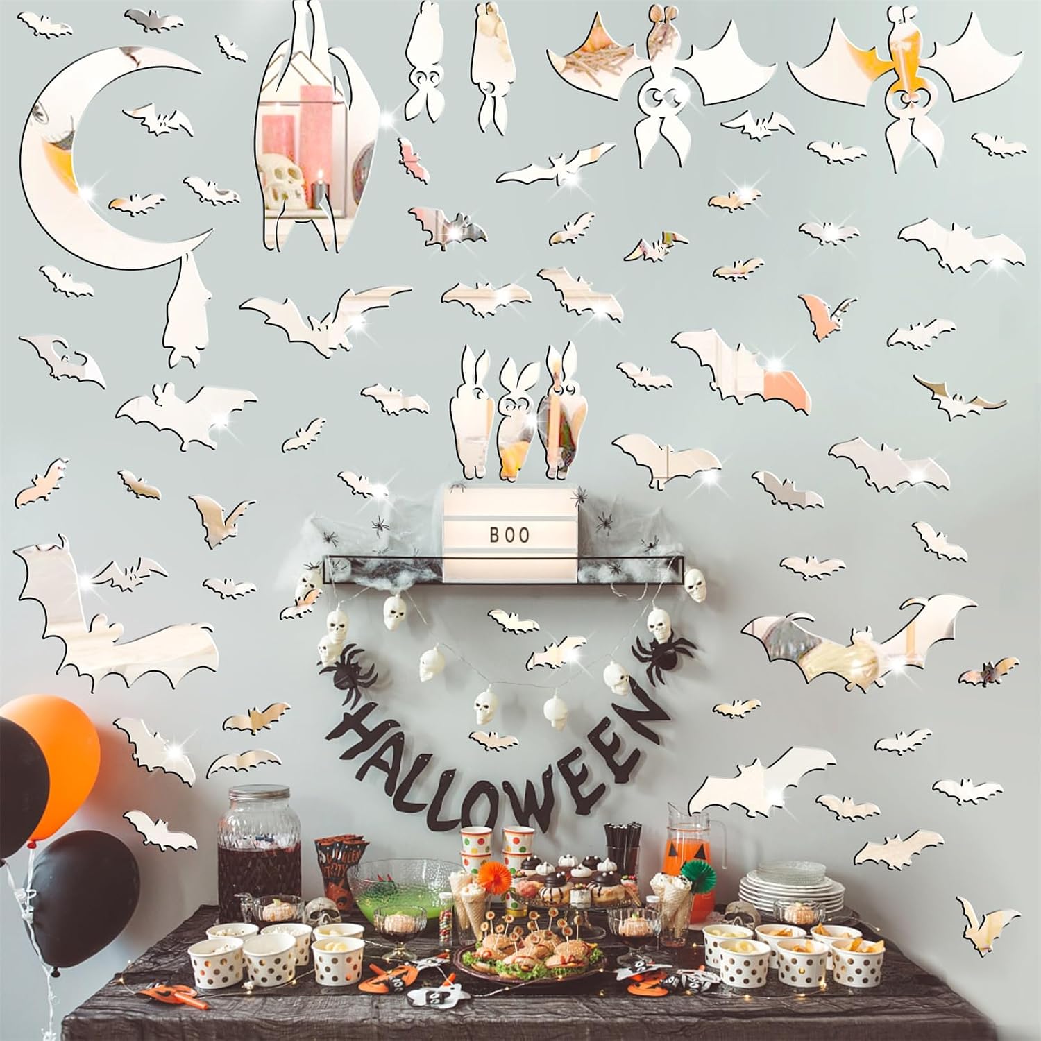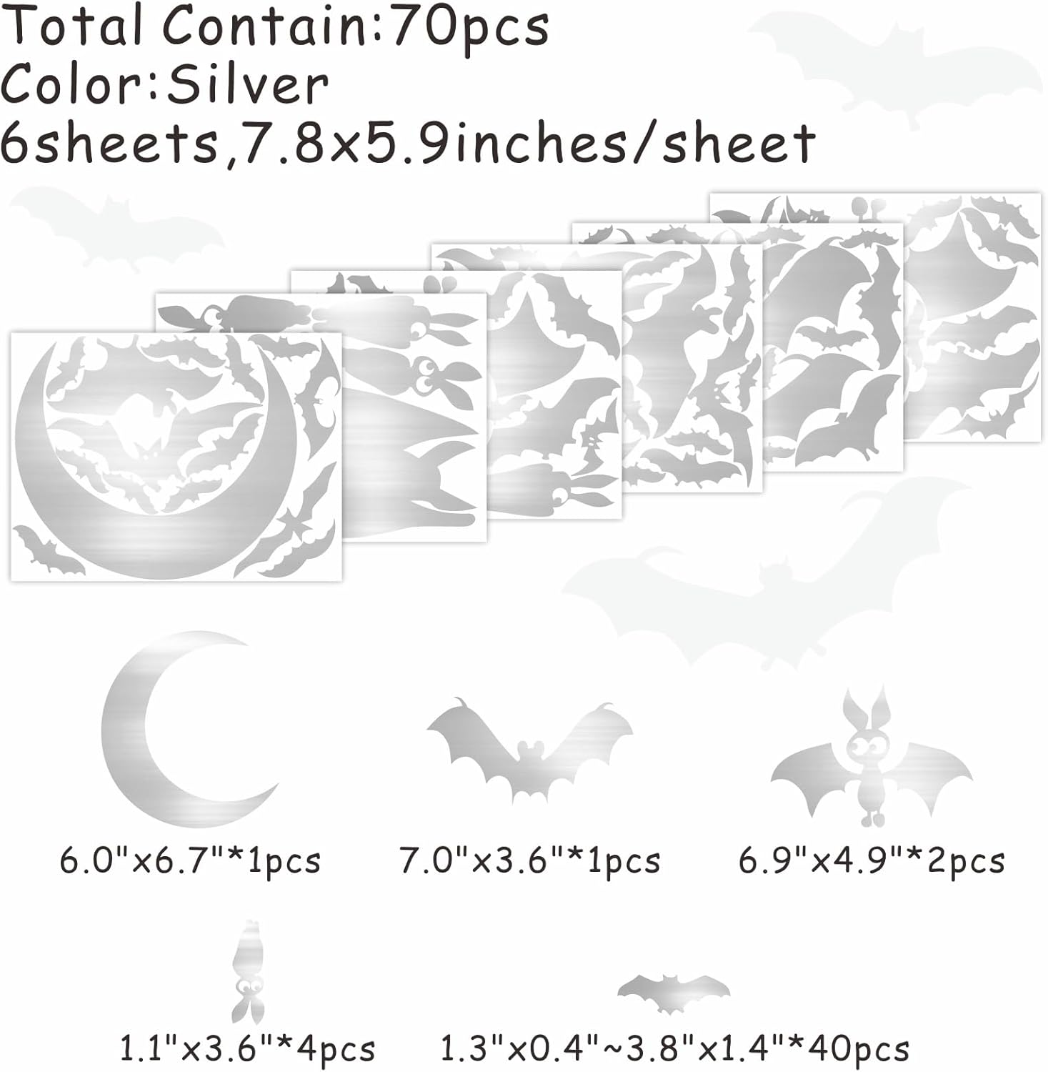- Bats mirror stickers include :7.8 x 5.9 inches /sheet , 6 sheets, (moon size :6.0’’x6.7’’x1pcs,bats size : 7.0’’x3.6’’~1.3’’x0.6’’x69pcs).