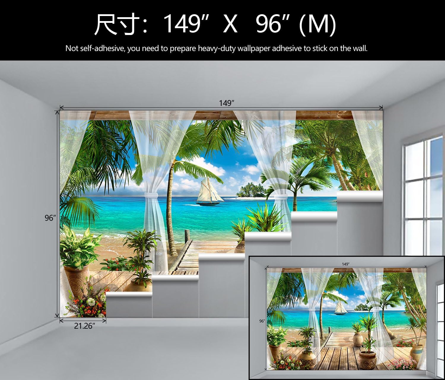 WFBHUA-Wall Mural Tropical Beach Palm Tree Wallpaper Balcony Window Seascape Landscape Wallpaper for Bathroom Living Room Bedroom (Not Peel and Stick)