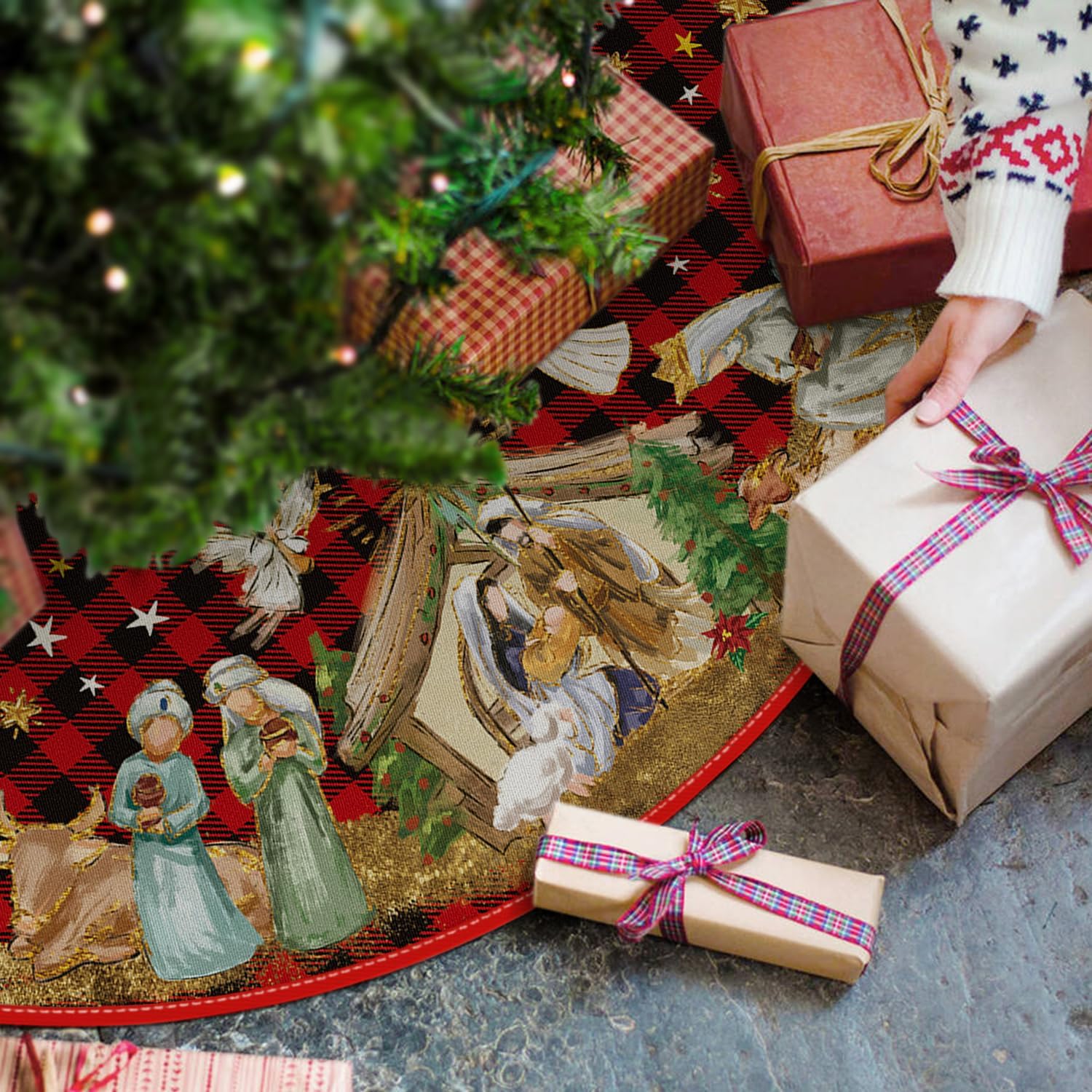 AVOIN colorlife Buffalo Plaid Christmas Tree Skirt 48 Inch, Winter Holiday Tree Decoration