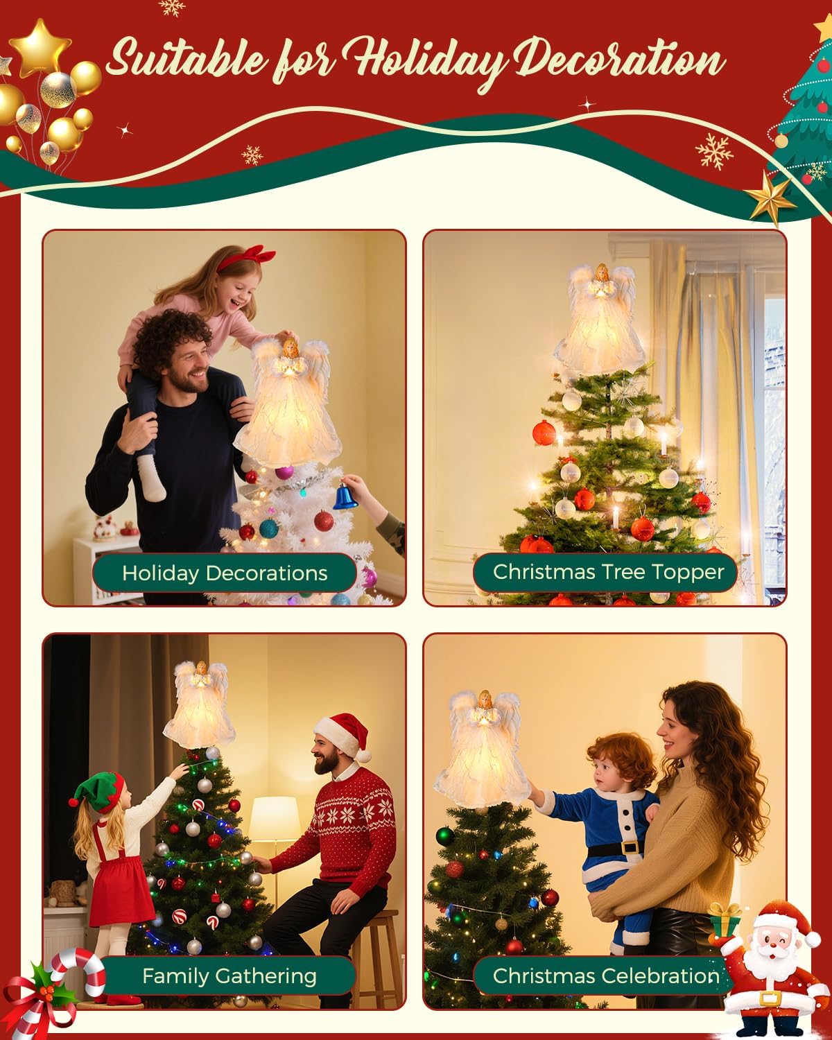 - 【Christmas Angel Tree Top Light】This angel is 16.9 inches high, suitable for 5-10 feet Christmas tree as decoration, also can be placed on tabletop and mantel as decoration, add elegant and luxurious shimmering light to your Christmas.