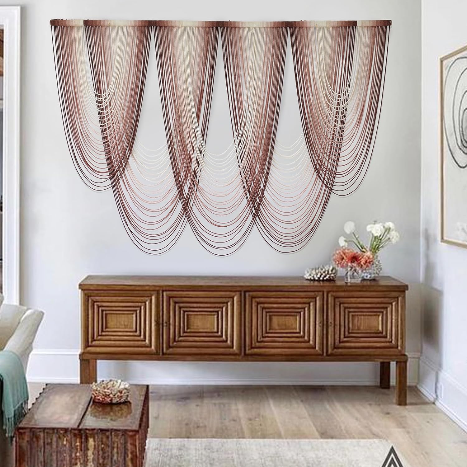 - Occasion: above bed headboard, living room wall, gallery wall, entrance hall wall, etc. The macrame craftsmanship art like this will suit perfectly a minimalist living room, bohemian bedroom, and warm mid-century office.