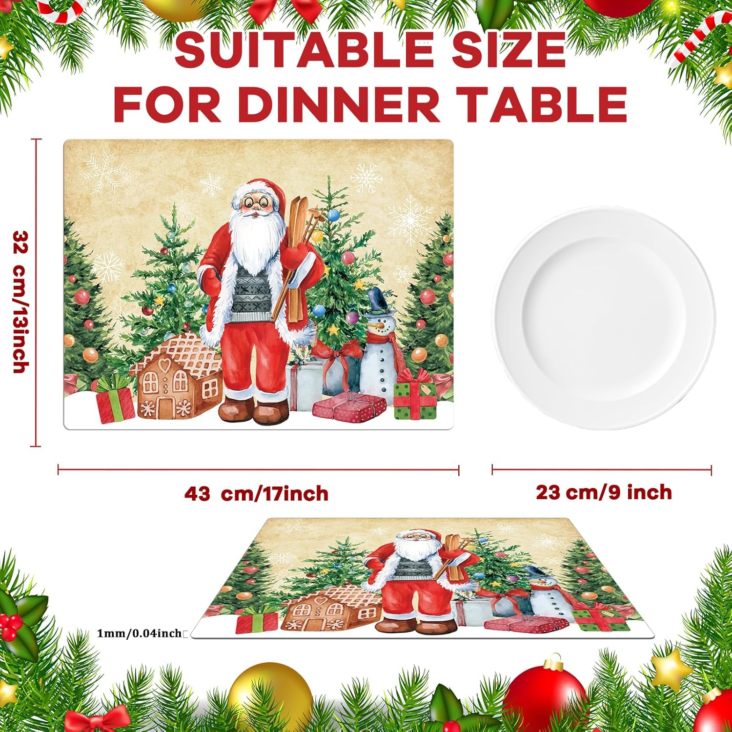 - 【Eye-Catching Design】Elevate your Christmas theme dining experience with our Retro Christmas placemats! The design of the Christmas placemat incorporates retro elements of the Santa Claus, Christmas tree, Gingerbread man and so on. Christmas plastic placemats add a touch of brilliance to your table setting. Impress your guests and create an unforgettable cheerful atmosphere for your party.