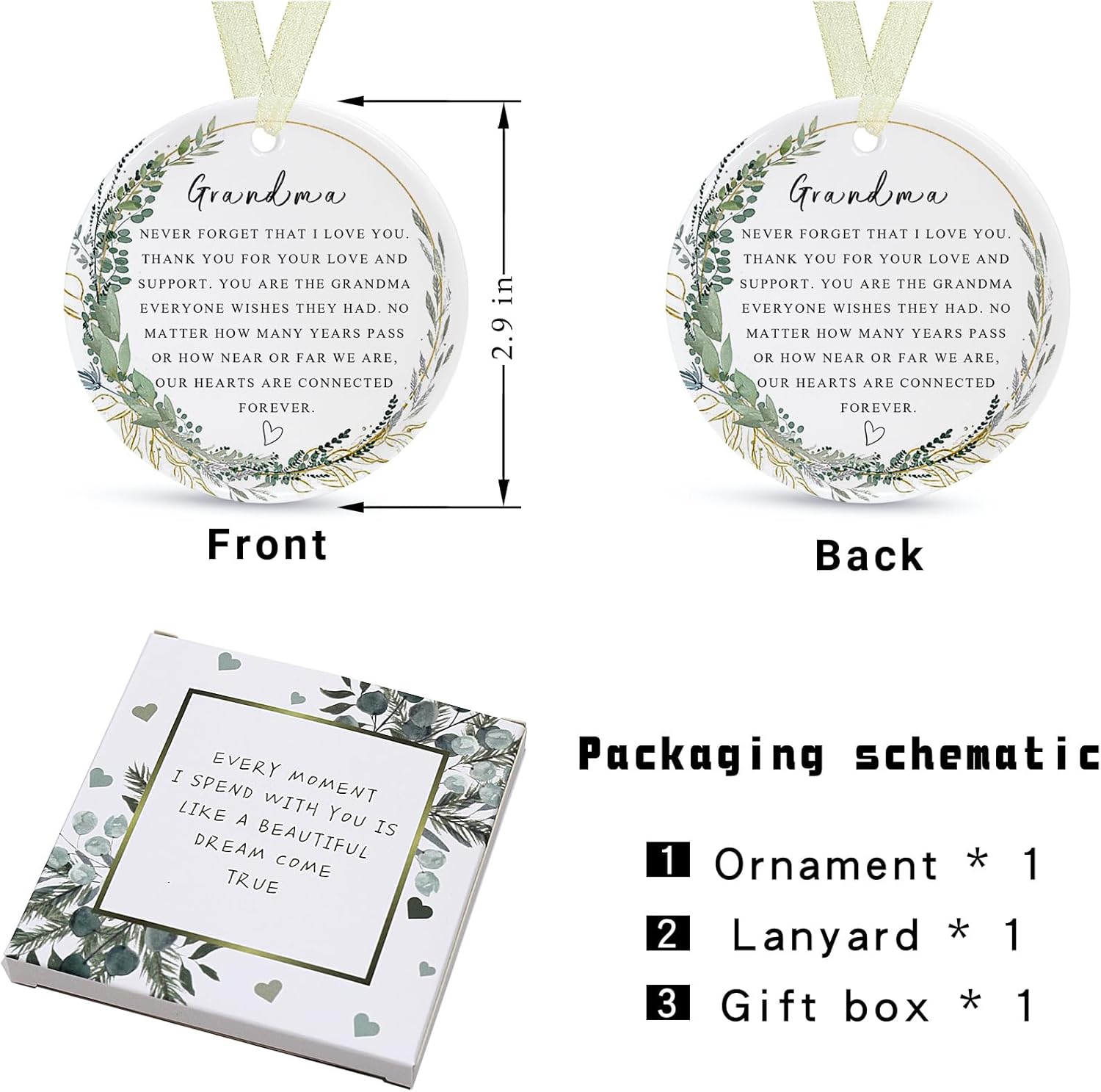 - 🌼【Perfect and delicate size】This is a grandma memory ornament with a diameter of 2.9 inches and a thickness of only 0.18 inches. The product includes: a round grandma ornamentt*1, a gift box*1 and a lanyard*1. The gift box comes with it makes it easy for you to give the best grandma ever gifts directly to family and friends and other special people in your life, and the lanyard that comes with it helps to hang it easily on the Christmas tree or anywhere you want.