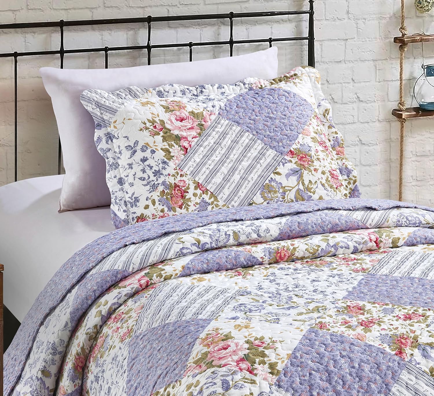 Brilliant Sunshine Rose Violet Patchwork, 2-Piece Quilt Set with 1 Sham, Reversible Bedspread, Soft Lightweight Coverlet, All-Season, Twin, Rose Violet