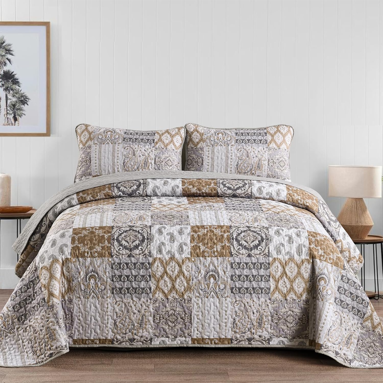 - PATCHWORK BOHO QUILT SET: The bedspread king size bedding set featuring a patchwork plaid design. Combined with bohemian stripe damask and paisley pattern gives this bedspread coverlet a elegant atmosphere.