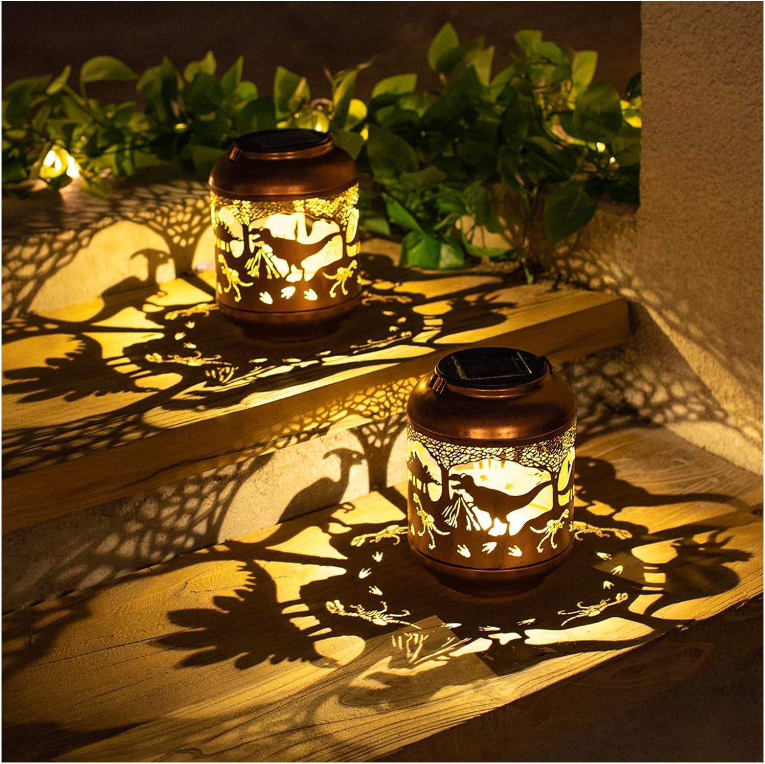 - 【Perfect Garden Decorations】Dinosaur solar lantern can project unique and beautiful patterns in a dim environment,creating a gorgeous and warm atmosphere to bring life and fun to your garden and attract your family or friends.The unique hollow out design and beautiful antique bronze color give it an artistic touch,perfect for decorating gardens,backyards,corners,Outside,sidewalks and many other scenes.