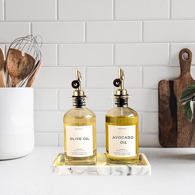 Olive Oil Dispenser For Kitchen With Silicone Tray & 40 Labels, Soy Sauce Dispenser, Coffee Syrup Dispenser, Olive Oil Bottles Set Of 2, Gold 500ml / 17oz