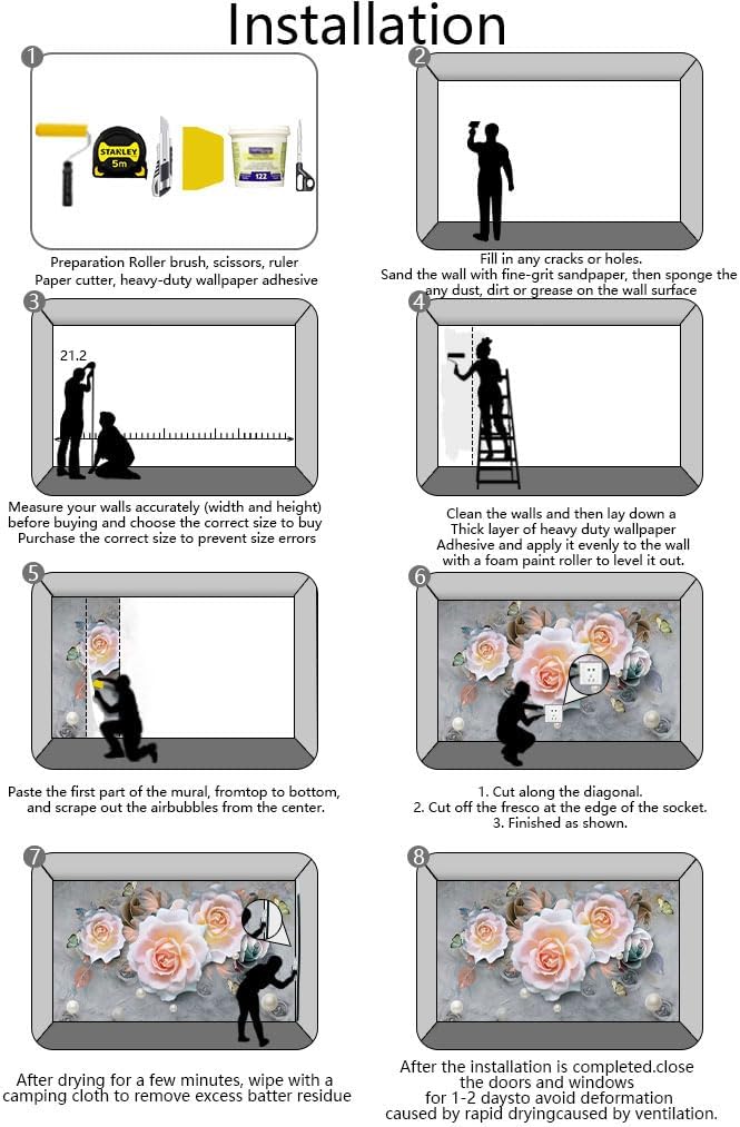 - Installation steps 1. Fill in any cracks or holes and clean the surface of the wall of dust, dirt and grease.2. Apply heavy-duty wallpaper paste to the wall, not the mural.3. Mark the position of each strip of wallpaper with a spirit level.4. Align the pattern and slide it into place.5. Scrape the bubbles with a spatula.6. Let it dry for a couple of minutes and it's ready to go!