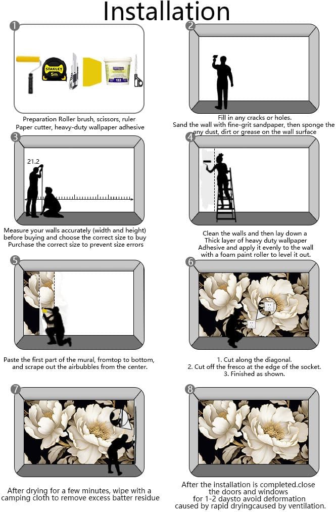 - Installation steps 1. Fill in any cracks or holes and clean the surface of the wall of dust, dirt and grease.2. Apply heavy-duty wallpaper paste to the wall, not the mural.3. Mark the position of each strip of wallpaper with a spirit level.4. Align the pattern and slide it into place.5. Scrape the bubbles with a spatula.6. Let it dry for a couple of minutes and it's ready to go!
