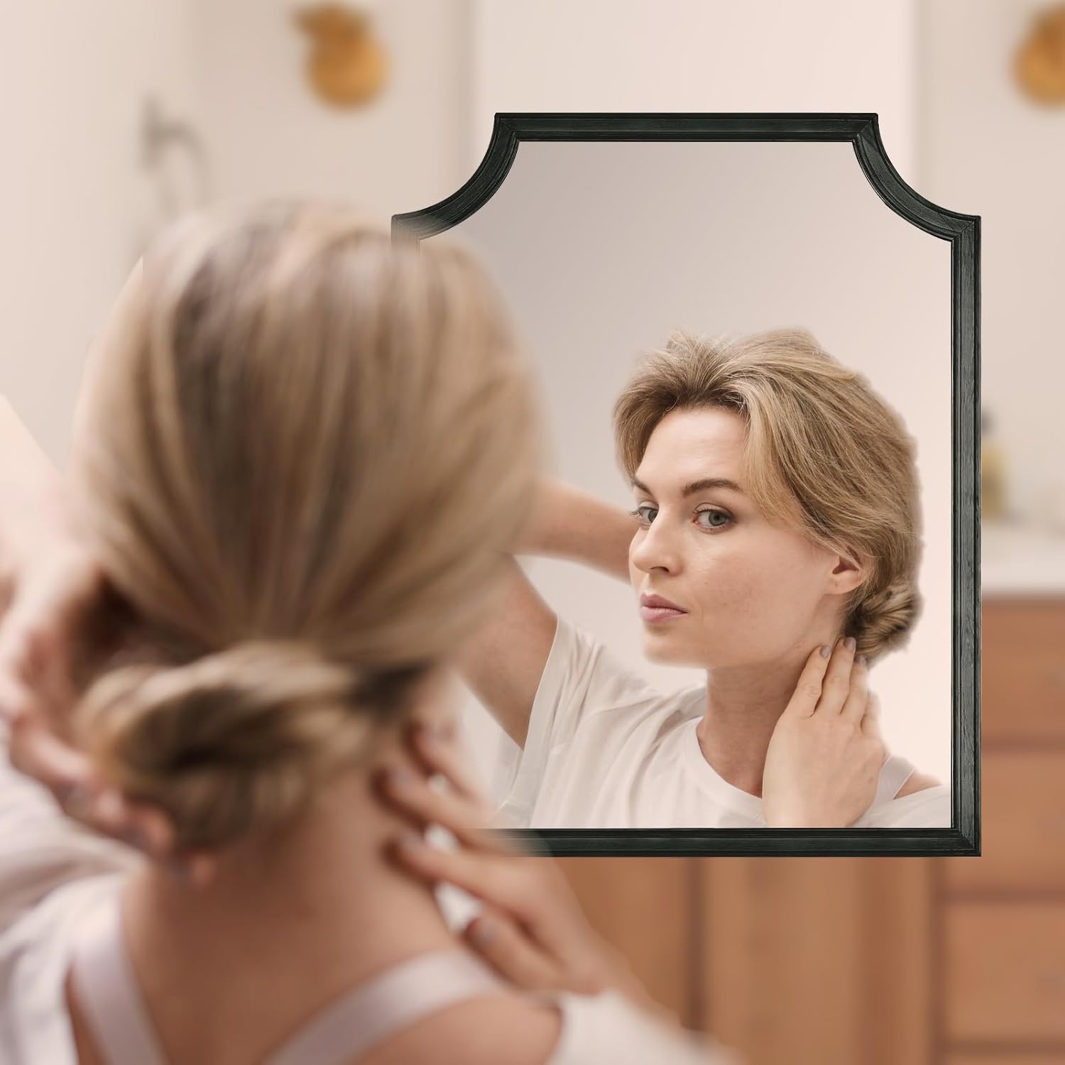 - Easy to install: back of the frame mirror has reinforced D-ring clips, measure the distance between the centers of the two back clasps, then use a ruler to draw the same distance on the wall, use a drill bit to make two holes where the hardware will be installed, install a screw in each hole until the screw head is about 0.2 inches from the wall, and finally secure the mirror.