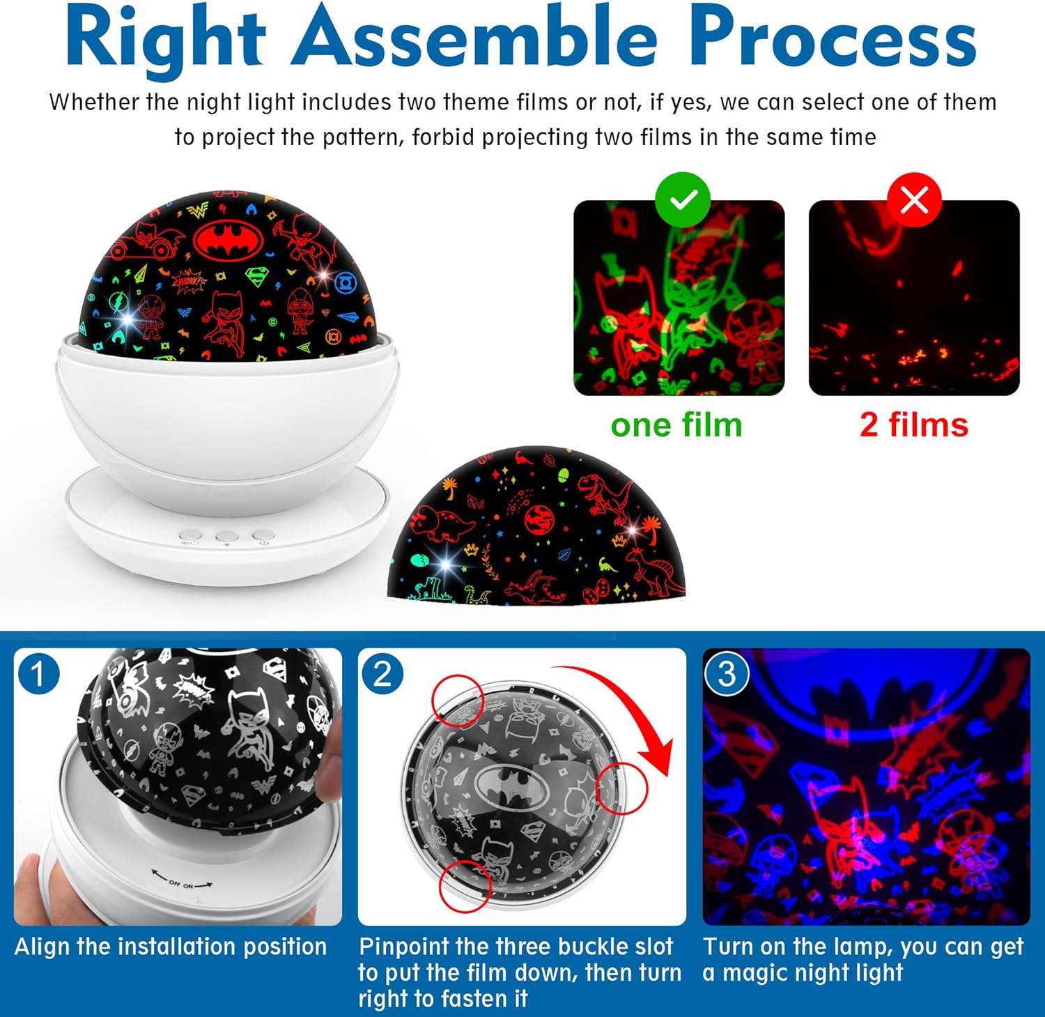 - 15 Color to Decorate Your Room: Baby Night Light light display different dinosaur/batman patterns with 15 color modes to create a variety of dinosaur elements on the wall and ceiling. The auto-rotating projector light brings you a different light show that let you into a fun atmosphere. The films are super easy to change out. You spin films to take out and replace the films