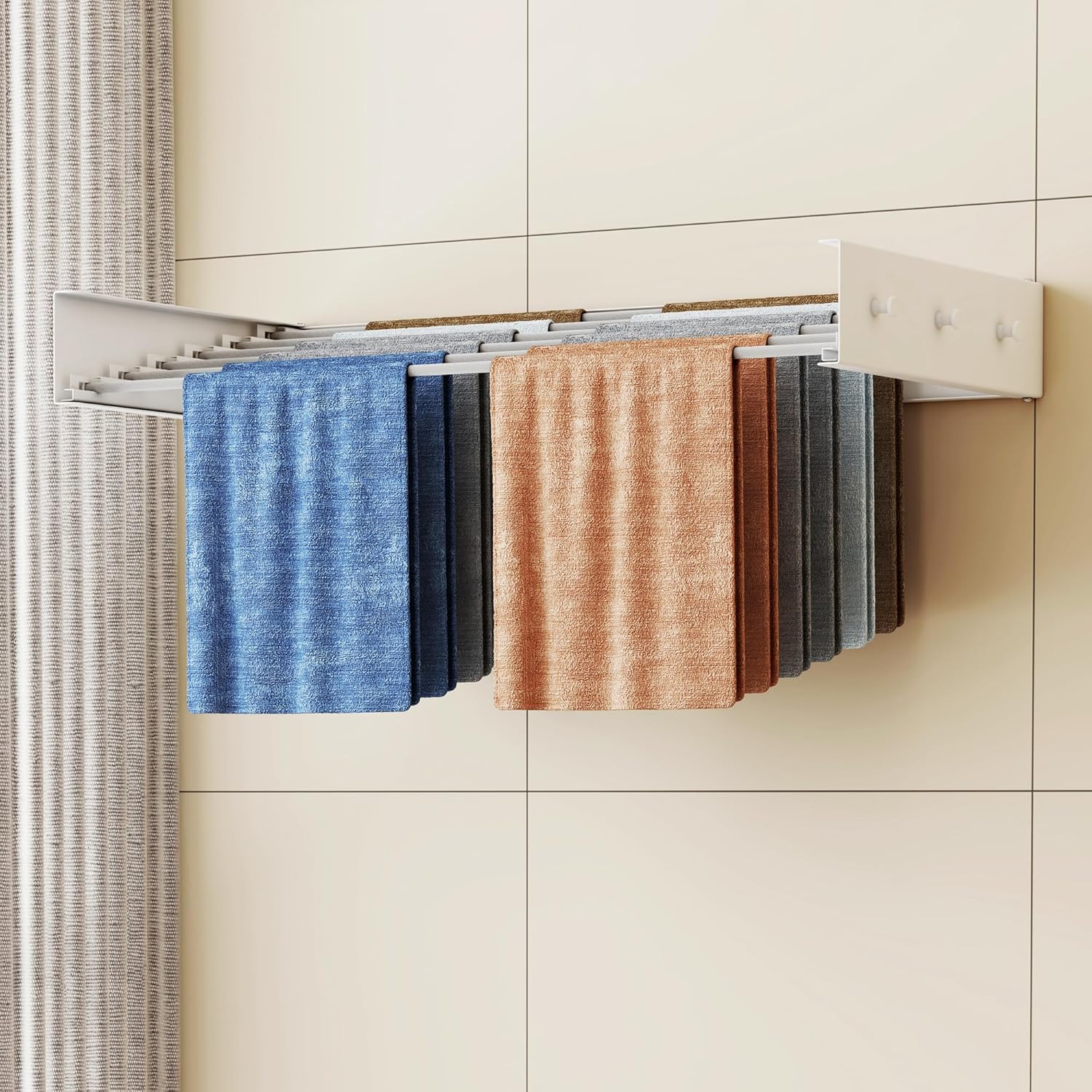Upgrade Drying Rack Clothing,Clothes Drying Rack Wall Mounted,Laundry Drying Rack Wall Mount,Foldable,Collapsible,Retractable,6 Aluminium Poles,with Hooks,(White 35.5"