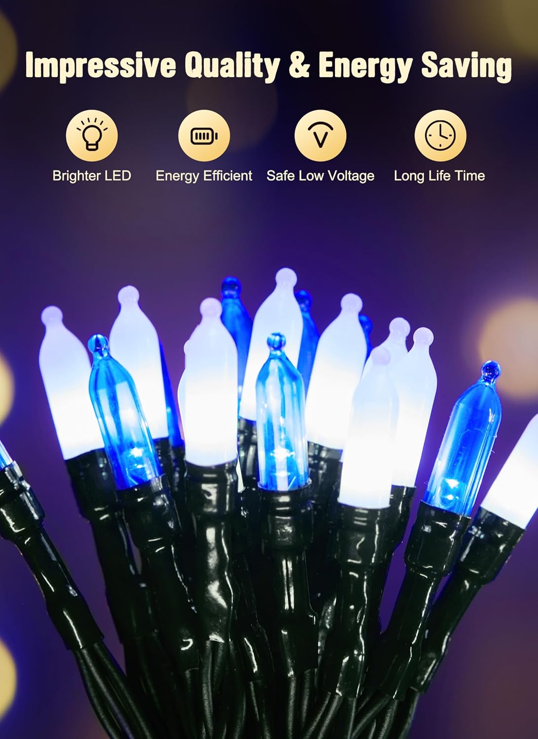 - Indoor Christmas Lights : 20 super bright blue & white color LEDs lights on 8 Ft. long wire with 4 inches distance between LED bulbs and 20 inches clear cable between wire and battery box