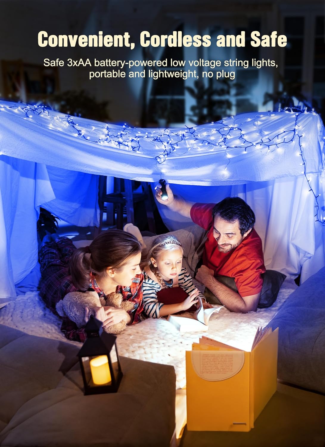- Energy Efficient Lights : This string lights are durable, made of premium cable with energy-efficient LED bulbs, it is bendable and sturdy wire with LED lights is waterproof. Press the button on Christmas lights battery case to power on, and to activate 6 hours lighting and 18 hours off mode, no worrying about forgetting to switch off the lights