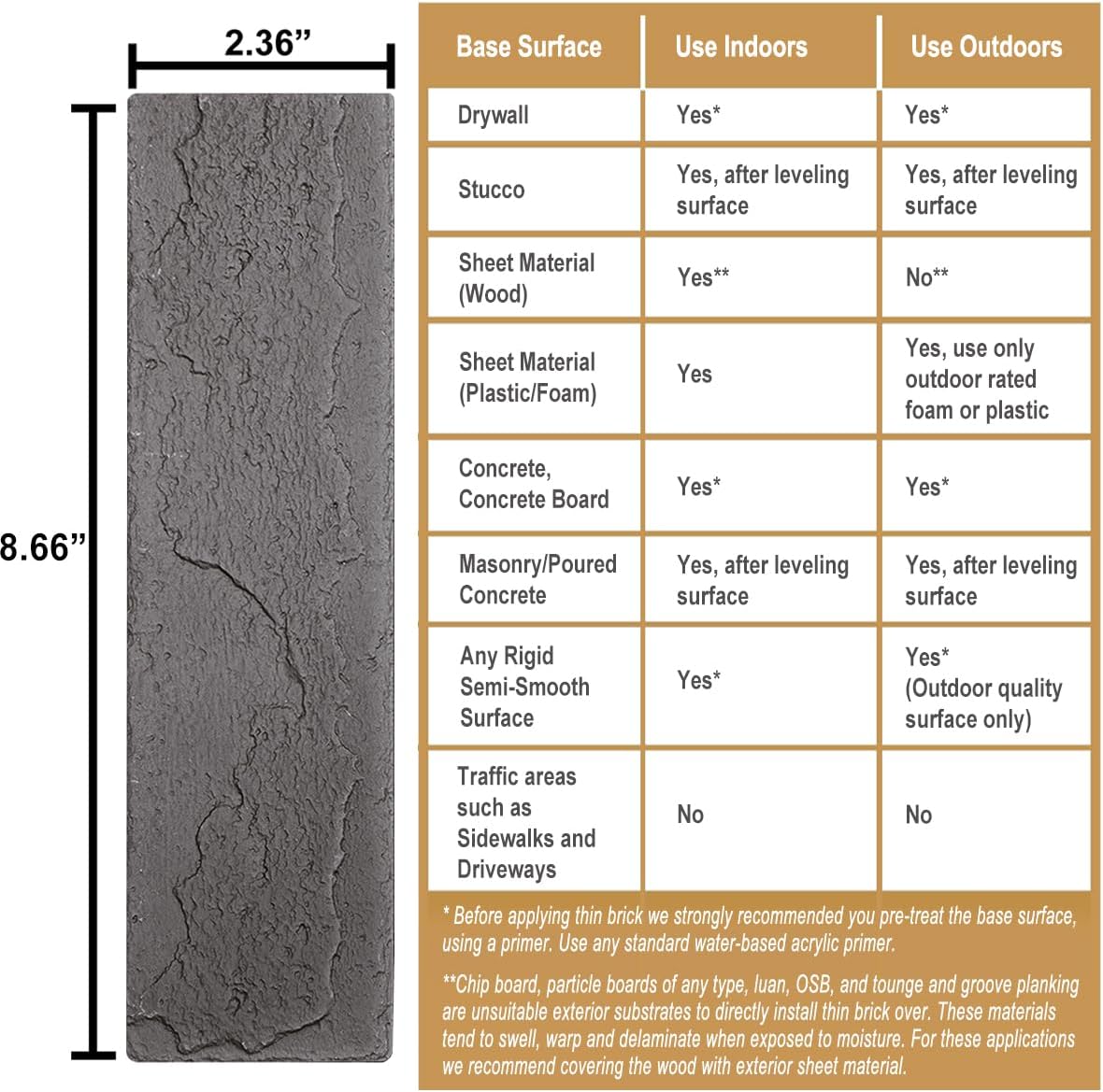 - Lightweight and easy to cut, no special tools needed, much easier for the do-it-yourselfer. Simply use a notched trowel spread the premixed tile adhesive to virtually any surface and press the single thin bricks sheets into place, half cost and time of conventional brick installation.